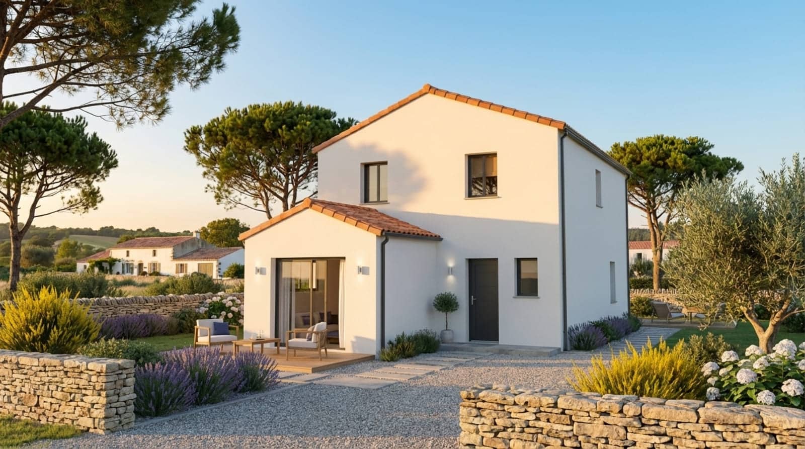 Les options les plus demandées par nos clients sont également disponibles pour personnaliser votre maison Nanteum : un carport pour protéger votre véhicule, des menuiseries en aluminium pour une durabilité accrue, et un enduit bi-ton pour une touche esthétique supplémentaire.